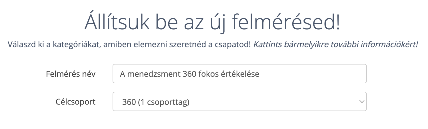 - Az “Állítsuk be az új felmérésed!” című oldalon a “Felmérés név” felirat mellett lévő mezőben írd át az elnevezést egy neked tetszőre (pl. “A menedzsment 360 fokos értékelése”). A “Célcsoport” felirat mellett lévő mezőnél ellenőrizd, hogy megfelelő csoportra indítod-e a felmérést.