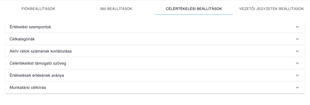 Meghatározhatsz értékelési szempontokat és célkategóriákat. Maximalizálhatod az aktív célok számát. Írhatsz célértékelést támogató központi üzenetet, amiben instrukciókat és hasznos információkat oszthatsz meg a célokért felelős munkatársakkal, pl. aktív célok maximális száma, az értékelés szempontjai stb. Beállíthatod az értékelések értékének arányát, tehát, hogy milyen arányban vegye a rendszer figyelembe a célok kapcsán a vezetői értékelést és az önértékelést. Engedélyezheted, hogy a munkatársak is írhassanak ki maguknak célt, a “Munkatársi célkiírás engedélyezése” lehetőség kijelölésével.