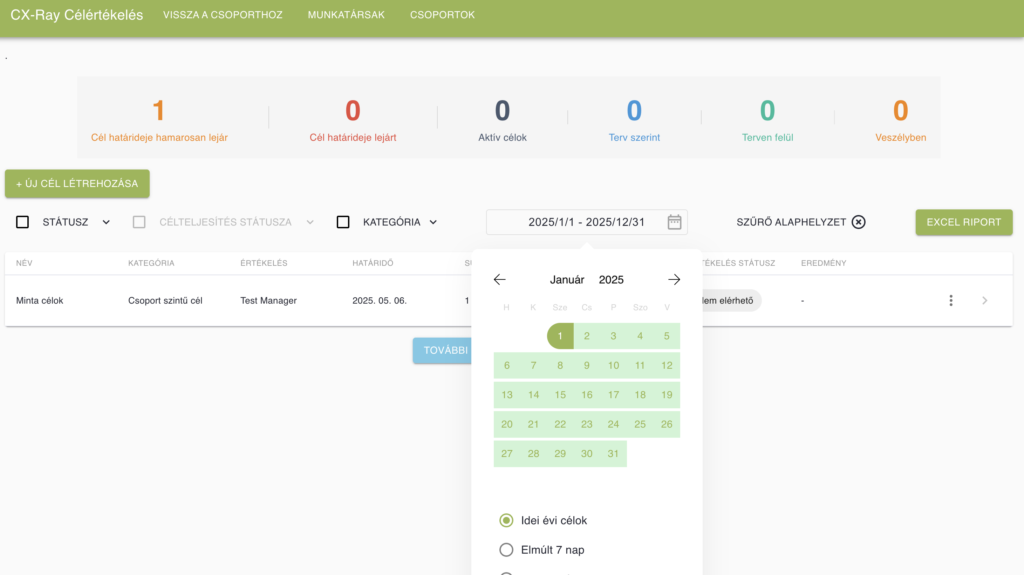 A csoport szintű célok letöltéséhez először válasszuk ki a riportálni kívánt időszakot. Ezt követően zölddé válik az “Excel riport” gomb a felületen, amelyre való kattintással le tudod tölteni a dokumentumot.
