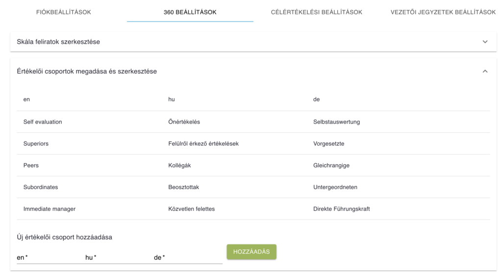 Az “Értékelői csoportok megadása és szerkesztése” felirat alatt tudod magyar, angol és német nyelven felvinni az újabb kategóriát. Az „Új értékelői csoport hozzáadása” menüpont alatt írd be az új kategória nevét, majd kattints a “Hozzáadás” gombra.