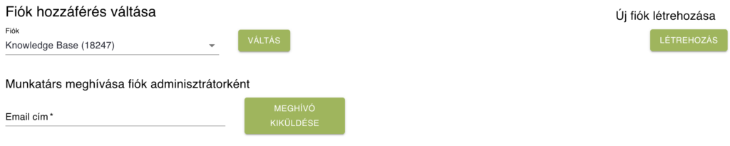 Kattints a főoldalon a jobb felső sarokban található email címre. A legördülő menüből válaszd ki a “Fiókjaim” lehetőséget. A megnyíló oldalon a “Munkatárs meghívása fiók adminisztrátorként” menüpont alatt add meg az email címét annak a személynek, akit szeretnél fiók adminisztrátornak kinevezni, majd kattints a zöld “Meghívó kiküldése” gombra.