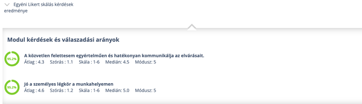 Ezután látni fogod az egyéni Likert skálás kérdések és a kifejtős kérdések eredményeit is. Az egyéni Likert skálás kérdések eredményét az oldal alján találod az “Egyéni Likert skálás kérdések eredménye” fülön.