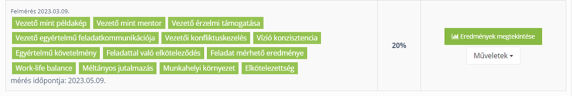 Miután lezártad a felmérést kattints a  „Csoportok” menüpontra, majd az érintett csoportnál a „Felmérések” gombra. A lezárt felméréseknél válaszd ki a megfelelő elégedettségi felmérést, majd kattints az „Eredmények megtekintése” opcióra.