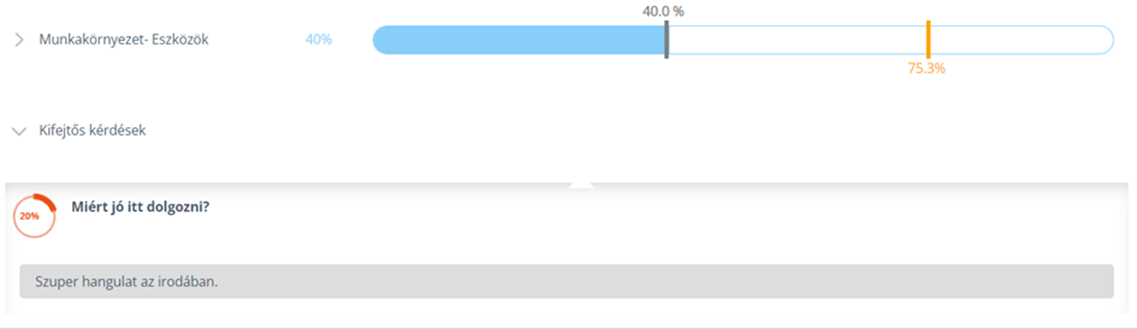 A szabad szöveges kérdések eléréséhez görgess az oldal aljára, majd nyisd meg a „Kifejtős kérdések” mellett található fület a munkatársak által adott egyéni szöveges válaszok megtekintéséhez.