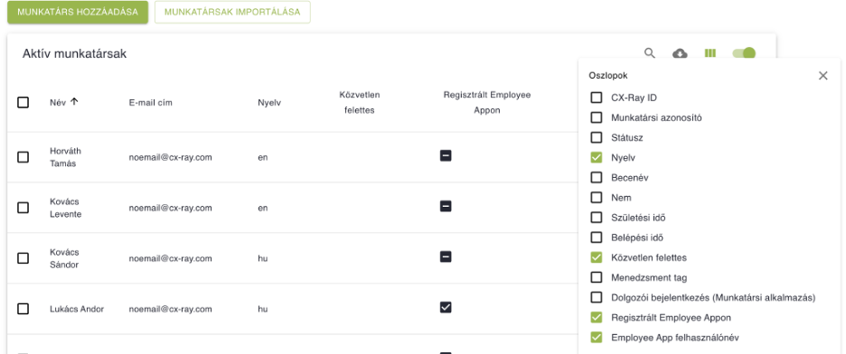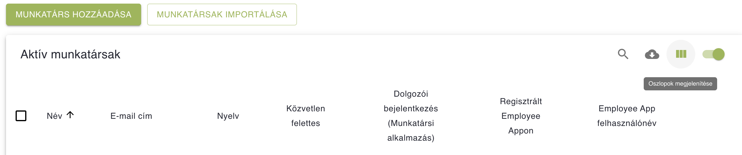 A Munkatársak fülön az Oszlopok lehetőségre kattintva tudjuk kiválasztani, hogy mely oszlopokat szeretnénk megjeleníteni a felületen.