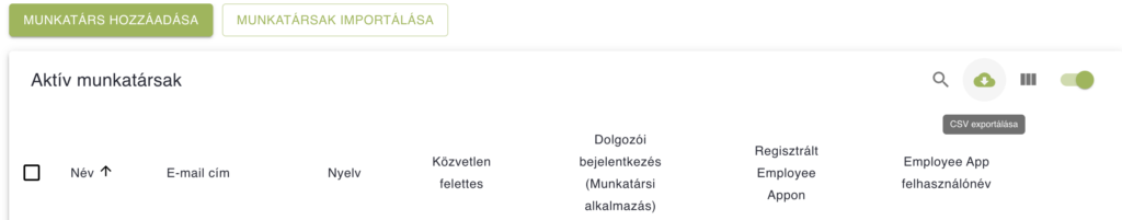 A másik lehetőség a regisztrációk nyomon követéséhez a munkatársi lista letöltése, ehhez kattintsunk a csv exportálása gombra:
