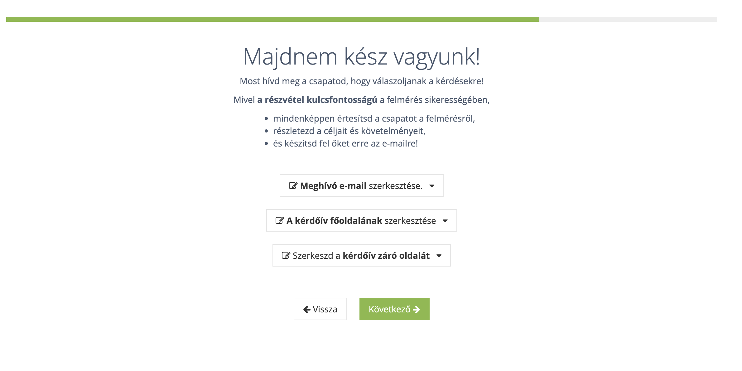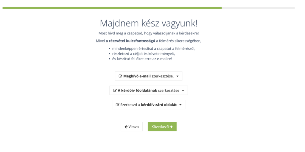 Felmérés indítása előtt mindig ellenőrizd le, hogy megfelelő lesz-e a kiküldendő emailnek a szövegezése. Ezt a fehér “Meghívó e-mail szerkesztése” gombra kattintva tudod megtenni. Itt a meghívó szöveg tartalmát a magyar mellett angolul és németül is tudod módosítani.