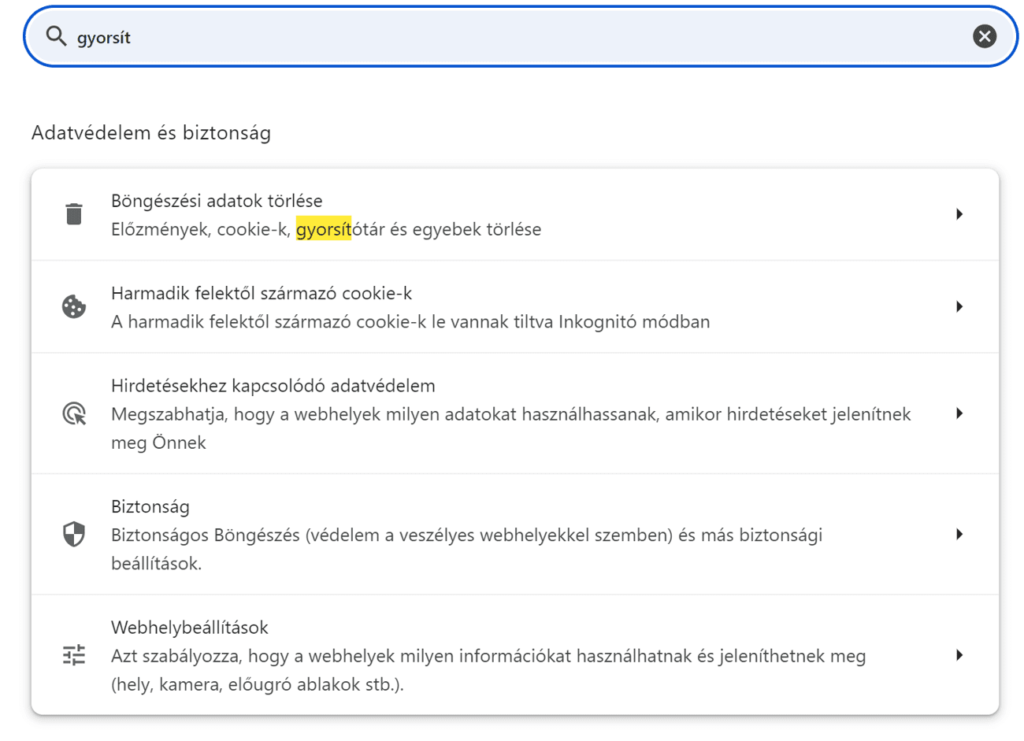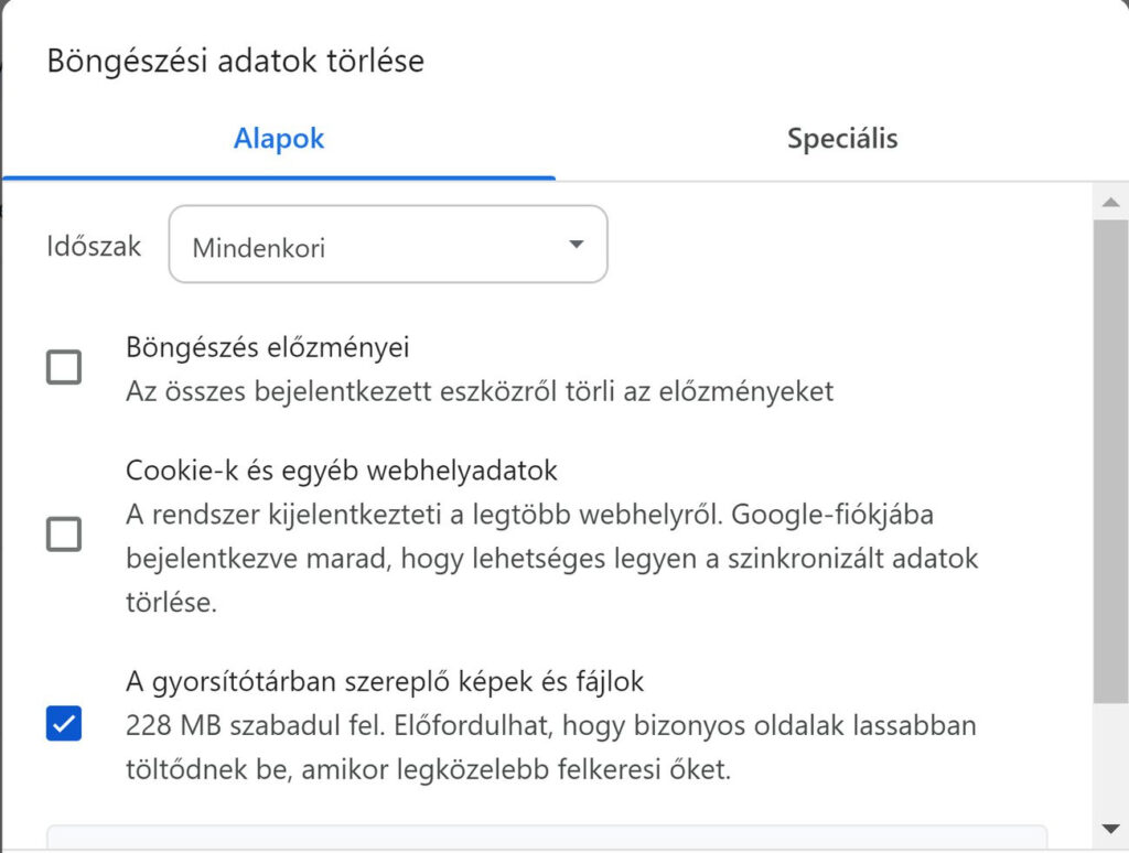 Chrome / Edge böngészőben (ahol a probléma a leggyakrabban előfordul) ctrl+F5 vagy Mac esetén a cmd+shift+r frissítés gomb megoldja a problémát. Ha továbbra is problémát tapasztalsz akkor, belépve a böngésző Beállítások menüpontjába, ott a keresőbe mezőbe beírva „gyorsítótár” kifejezést a böngészési adatok törlése találatra kell kattintani. A felugró menüből csak a „A gyorsítótárban szereplő képek és fájlok” variációt szükséges bepipálni. Ebben az esetben a bevitt űrlapok, jelszavak, bejelentkezések NEM törlődnek, azaz semmilyen funkciókiesés nem fog történni. A böngésző ez esetben be tudja tölteni a honlap jelenlegi állapotát és meg tudja jeleníteni az adatbázisunkból kinyert adatokat.