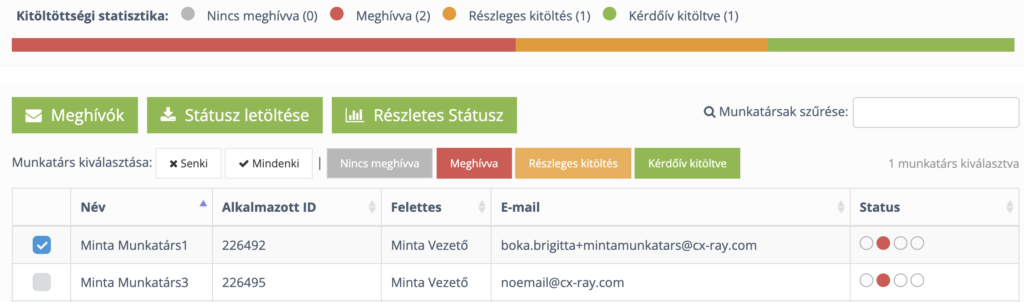Miután kijavítottad a hibás email címet, a “Csoportok” menüpont alatt a megfelelő csoportot kiválasztása után, kattints a “Futó felmérések” fülön, a “Meghívók” gombra. A megnyíló oldalon láthatod a részletes kitöltési státuszt. Bal oldalon kék pipával vannak jelölve azok a résztvevők, akik eddig nem kezdték meg a kitöltést. Ha csak 1-2 kollégának szeretnéd újra küldeni a meghívót ellenőrizd, hogy csak az ő nevük mellett legyen kék pipa. Miután ez megtörtént, kattints az oldal tetején található zöld “Meghívók” gombra, az így megnyíló ablakon belül pedig a “Meghívók küldése” gombra, így az összes korábban megjelölt munkatárs megkapja ismét a meghívó emailt.