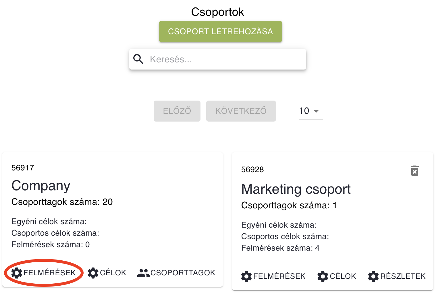 A felmérés előkészítéséhez lépj be a felületre, majd kattints a „Csoportok” menüpontra. Itt válaszd ki a „Company” csoportot, ha az egész szervezetre szeretnéd indítani a felmérést. A csoportnál kattints a „Felmérések” opcióra, majd az itt megnyíló felületen az „Új felmérés indítása” gombra.